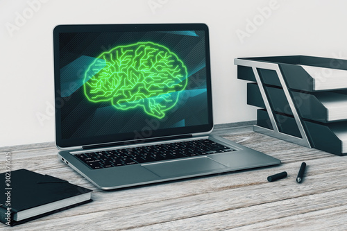 Laptop closeup with brain drawing on computer screen. Big data concept. 3d rendering.