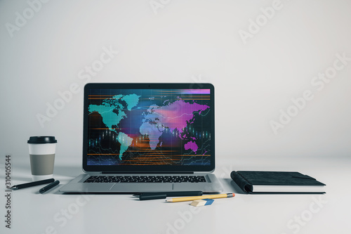 Laptop closeup with forex graph and world map on computer screen. Financial trading and education concept. 3d rendering.