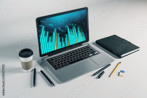 Laptop closeup with forex graph on computer screen. Financial trading and education concept. 3d rendering.