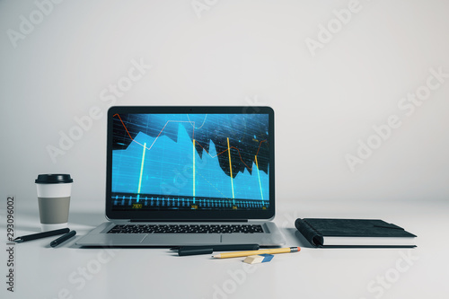 Laptop closeup with forex graph on computer screen. Financial trading and education concept. 3d rendering.