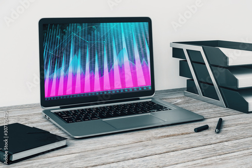 Laptop closeup with forex graph on computer screen. Financial trading and education concept. 3d rendering.