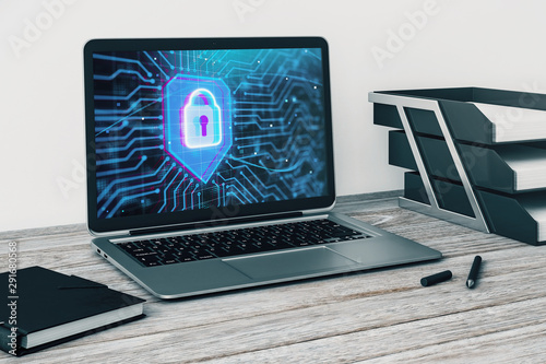 Laptop closeup with lock icon drawing on computer screen. Data safety concept. 3d rendering.