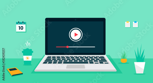 laptop computer desk video player icon, concept of laptop desk webinar, laptop business, computer online training, computer education. flat laptop computer vecotr illustration
