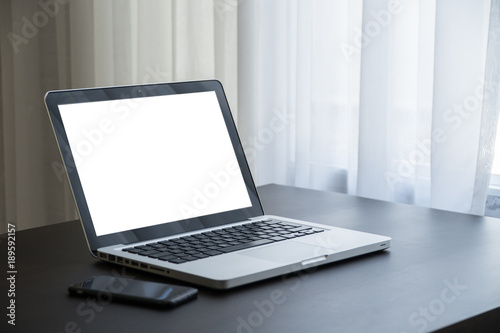 Laptop computer on desk,Office workplace environment,Laptop screen mock up on table.