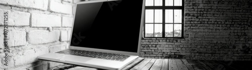 Laptop computer on white concrete shelf background banner.