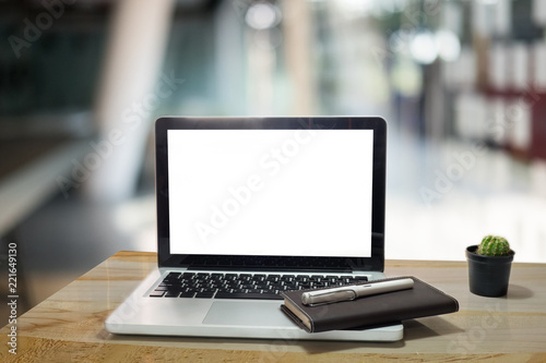 Laptop computer on workspace with mockup empty screen of laptop of present.