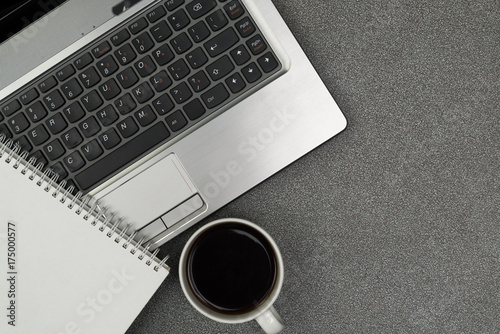 Laptop computer or notebook, note and cup of coffee on working table with copy space top view.