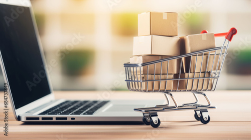 Laptop computer with small shopping cart with boxes as online shopping concept