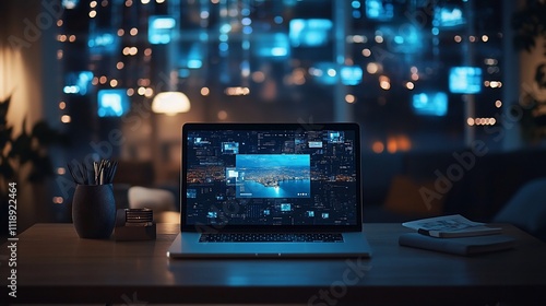 Laptop displaying futuristic data visualizations in a cozy home office at night.