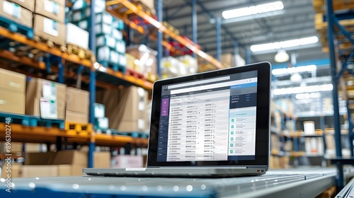 Laptop displaying inventory management software in a warehouse with shelves
