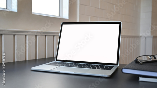 Laptop empty screen with glasses and notebook on black table.