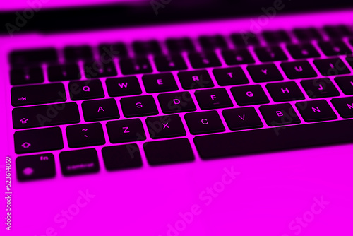 Laptop keyboard in neon pink glow lamps. Modern, slim, backlit membrane laptop keyboard. Selective focus. Focus on laptop keys with blurred background.