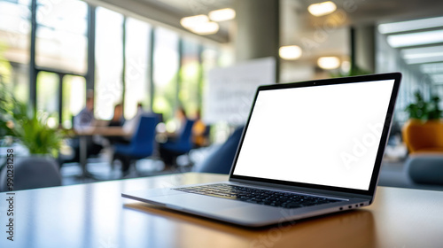 Laptop on a table with a blurred background.