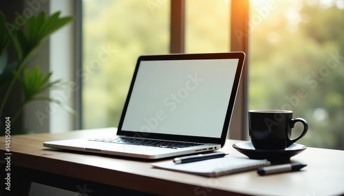 Laptop on desk, empty coffee cup, window view, education, mouse, homebound
