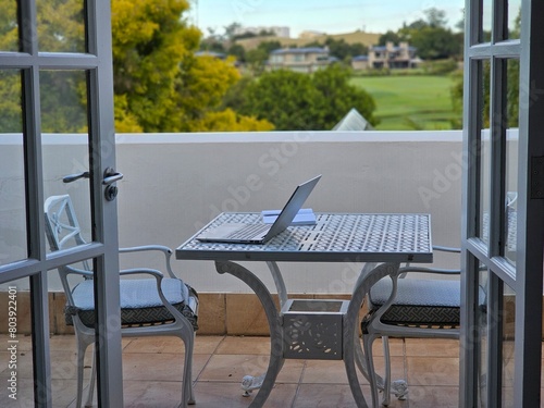 Laptop on the table on the balcony. Freelancing and remote work concept.