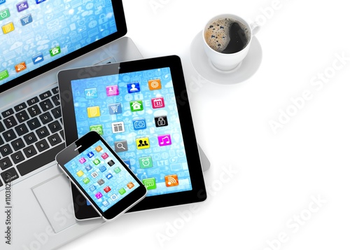Laptop, phone, tablet pc and coffee. 3d rendering.