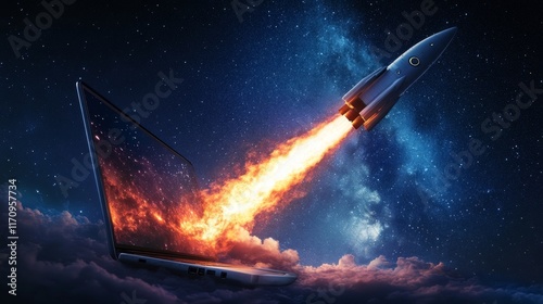 Laptop screen displaying a rocket launching into a starry night sky amidst clouds