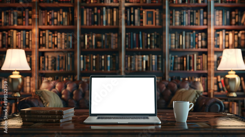 Laptop screen mockup in classic library reading room with vintage bookshelves, cozy atmosphere