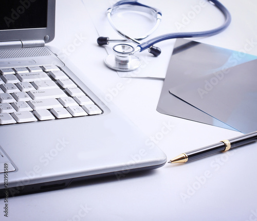 laptop ,stethoscope and x-ray on the table