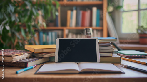 Laptop und Grafik Tablet auf dem Schreibtisch in der Schule oder im Studium mit blnko Display als Vorlage Generative AI