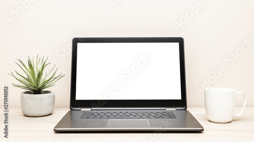 Laptop with blank screen on desk, home office background, screen replacement, working from home, wooden table background