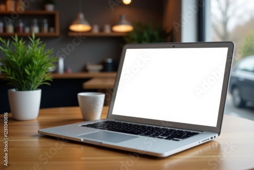 Laptop with blank screen on wooden table in modern cafe , cafe, screen