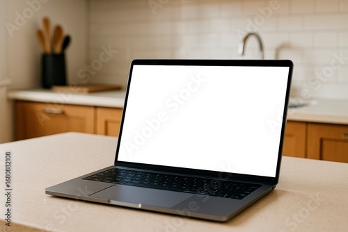 Laptop with blank white screen on kitchen counter used as mockup for design or presentation display in bright home interior background. Ai generative