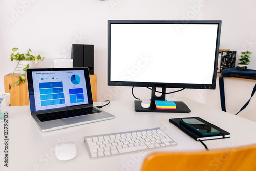Laptop with charts and graphs near desktop PC on desk in office