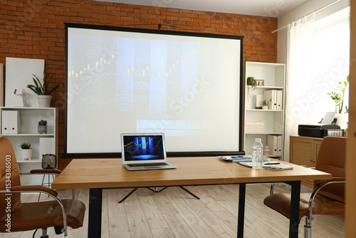 Laptop with diagrams of exchange rates on table and projector screen in office