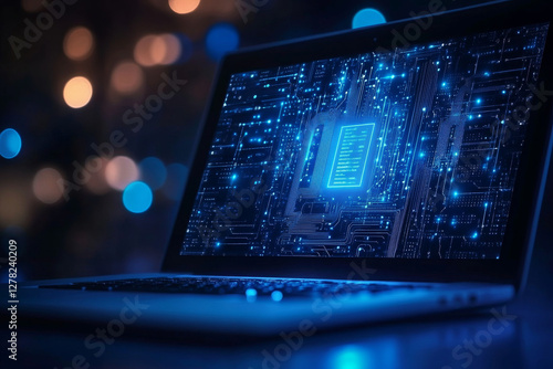 laptop with digital circuit board background glowing blue