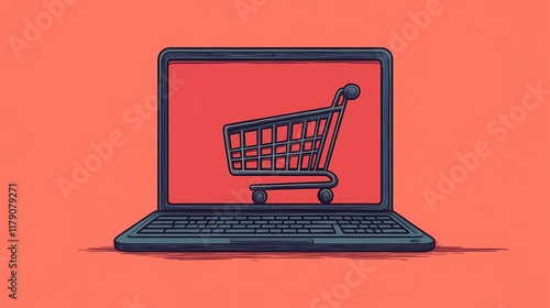 Laptop with floating shopping cart and box illustrations, representing e-commerce and digital shopping in a clean abstract illustration.