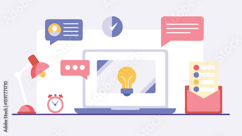 Laptop with lightbulb on screen and desk items like lamp clock and messages in a flat design style