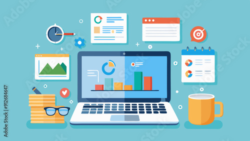 Laptop with SEO Analysis Tool Interface and SEO Strategy Diagram on Whiteboard. Perfect for: Marketing Workshops, Home Offices