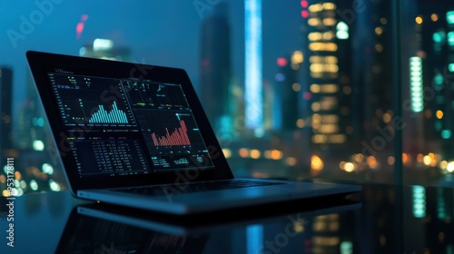 Laptop with Stock Market Data on a Desk Overlooking a Night City