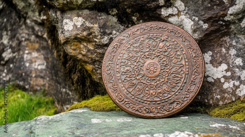 Large ancient bronze shield with detailed etchings placed on a green stone wall.