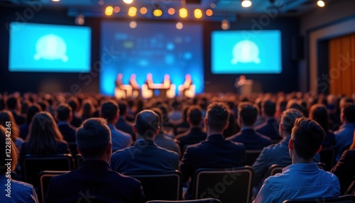Large audience attends conference session with panel discussion. Attendees seated in modern convention hall. Blue lighting highlights stage. People listen attentively. Event professional atmosphere.