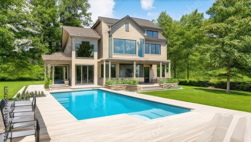 Large beautiful house with a swimming pool and a green lawn on the territory