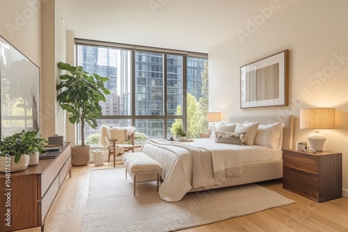 Large bedroom with a white bed, a white rug, and a white dresser. Banner