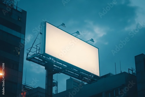 Large blank billboard on building facade illuminated by evening city lights with a blurred background creating a minimalist urban atmosphere