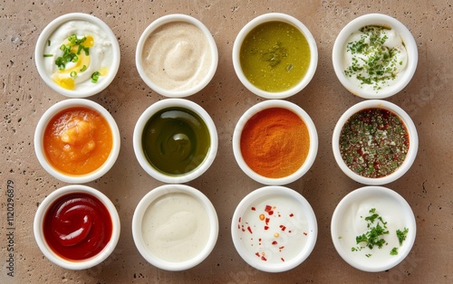 Large collection of sauces and spiced spreads in small jars. Big Set of colored dipping sauces in Crockery. Different types of dressing, mayonnaise, mustard, soy sauce, oil and ketchup on a black.