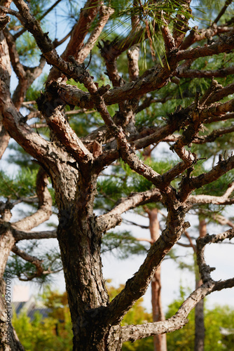 Large coniferous tree. Close-up and branches of a tree trunk on top. Pine branches grow in different directions, view from below. Pine tree against the blue sky.