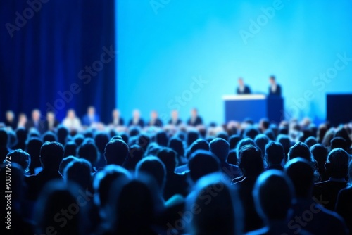 Large crowd gathered in front of a conference stage with speakers, set against a blurred blue background, capturing the event atmosphere.