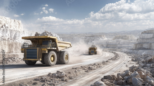 Large Dump Truck Hauling Lithium Material in Dusty Open Pit Mining Site