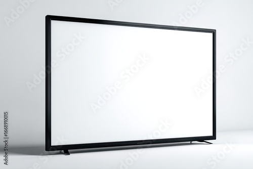 Large, flat-screen television with a thin black bezel, sitting on a minimalist white background, angled slightly to the viewer's left