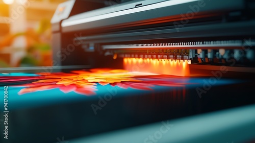 Large format printer ejecting a detailed, colorful print, sharp focus on the inkjet precision, office setting with natural lighting, high-definition textures, realistic style