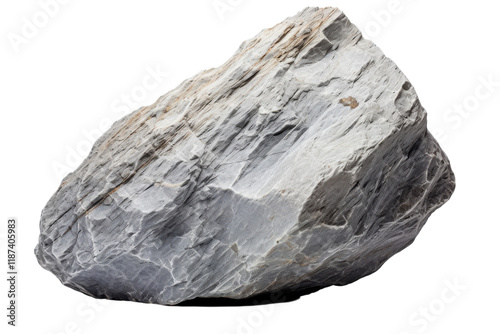 Large gray rock with textured surface displayed on a white background in a studio setting
