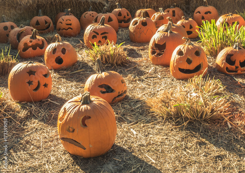 Large Group of Carved Halloween Pumpkins at Sunset
