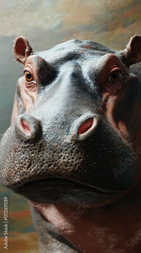 Large hippopotamus portrait captured in a natural habitat with intricate details of skin texture and expression at midday