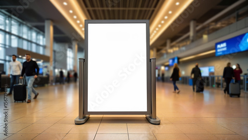 Large isolated light box with blank white screen stands in a busy airport terminal with travelers in the background. Suitable for advertising, information display, or promotional content in