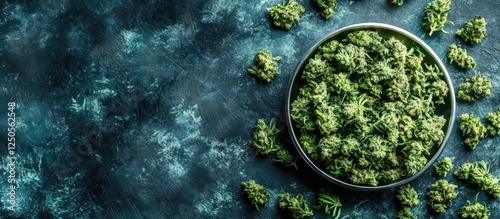 Large metal scoop with cannabis buds on scale against textured background ideal for advertising or informational content.